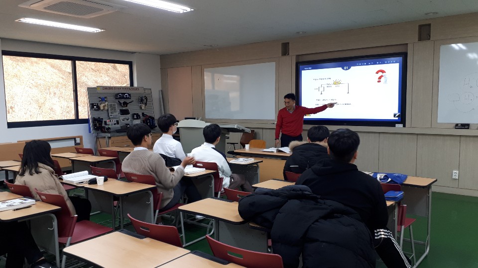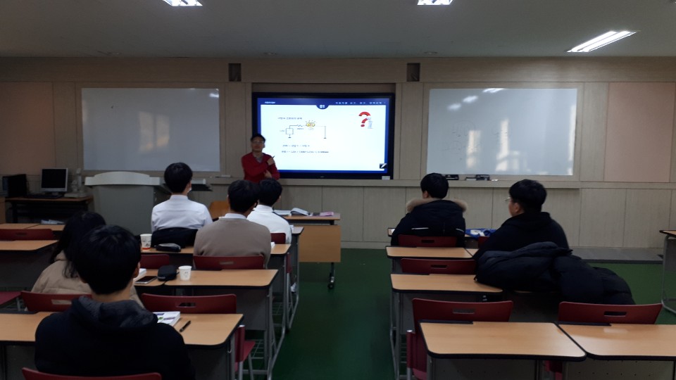 자동차에 관련된 강의(이론,실습)를 듣고 있는 모습이다.