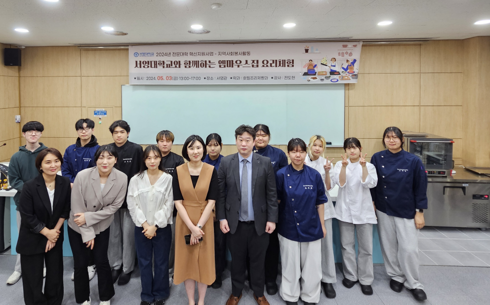 서영대학교 호텔조리제빵과는 최근 엠마우스집 발달장애인 50여명을 초청해 '서영대학교와 함께하는 엠마우스집 요리체험' 행사를 진행했다고 12일 밝혔다.
