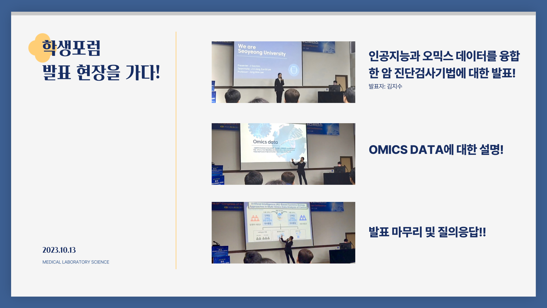 학생포럼에는 우리대학 임상병리과 1학년 김○수 학생팀이 ‘인공지능과 오믹스 데이터를 융합한 암 진단검사기법’이라는 주제로 발표하여 대상을 수상하였고, 2학년 황○영 학생팀 ‘FOR THIS THE POSTER DEMANDS FOR CHANGES IN THE EDUCATIONAL CURRICULUM OF CLINICAL PATHOLOGY TO PAVE THE FUTURE OF BIOMEDICAL HEALTH IN THE AI ERA’ 주제로 영문 포스터를 발표하여 국제우수포스터상을 수상하는 쾌커를 거뒀습니다.