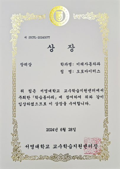 미래자동차과 정비 학습동아리인 오토마이스터가 서영대학교 교수학습지원센터에서 주최한 학습 동아리에 여하여 이수하고 "장려상"을 수상하였습니다.