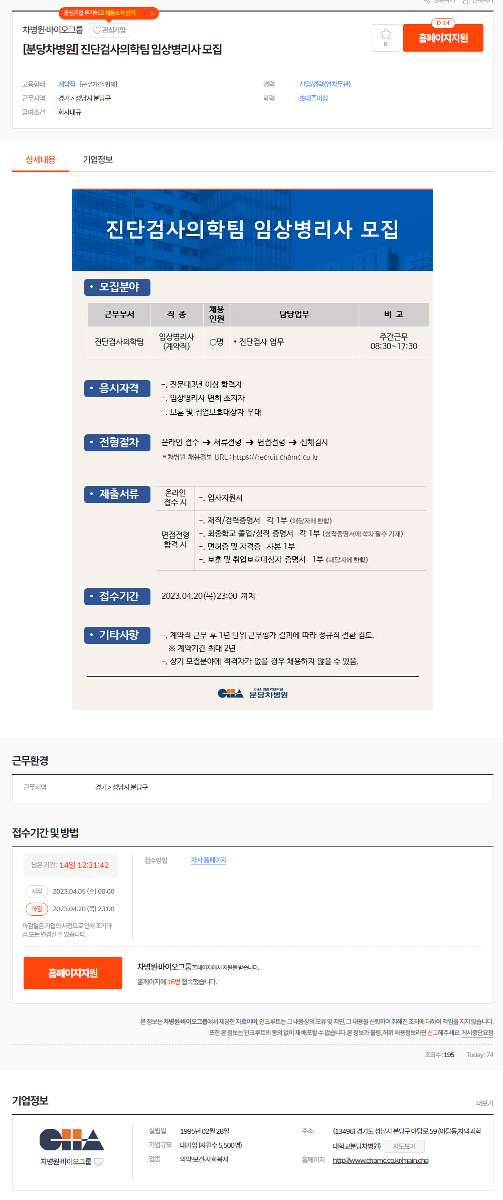 차병원·바이오그룹 채용 : [분당차병원] 진단검사의학팀 임상병리사 채용 - 인크루트 채용정보 (incruit.com)