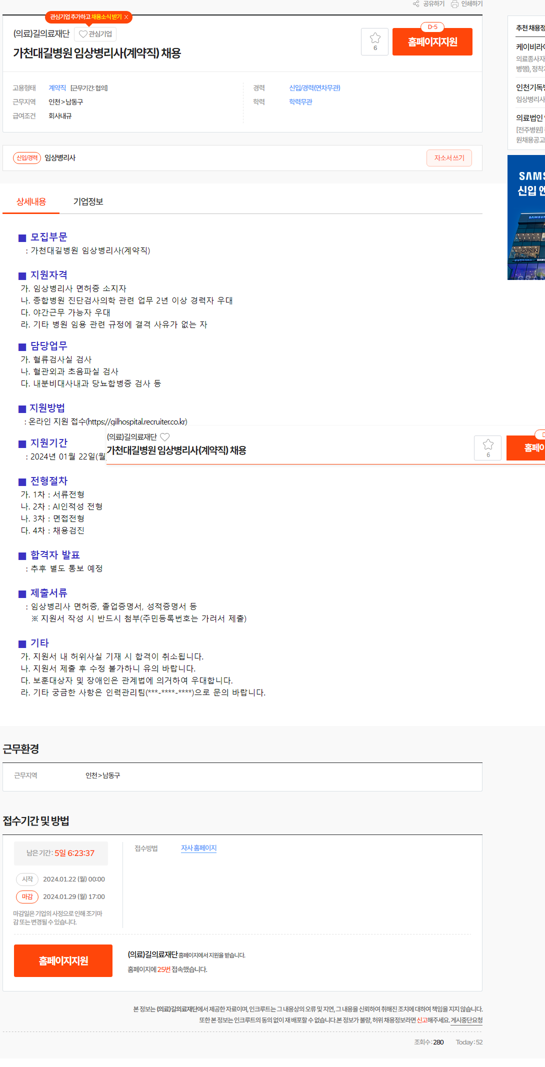 의료길의료재단 채용 : 가천대길병원 임상병리사(계약직) 채용 - 인크루트 채용정보 (incruit.com)