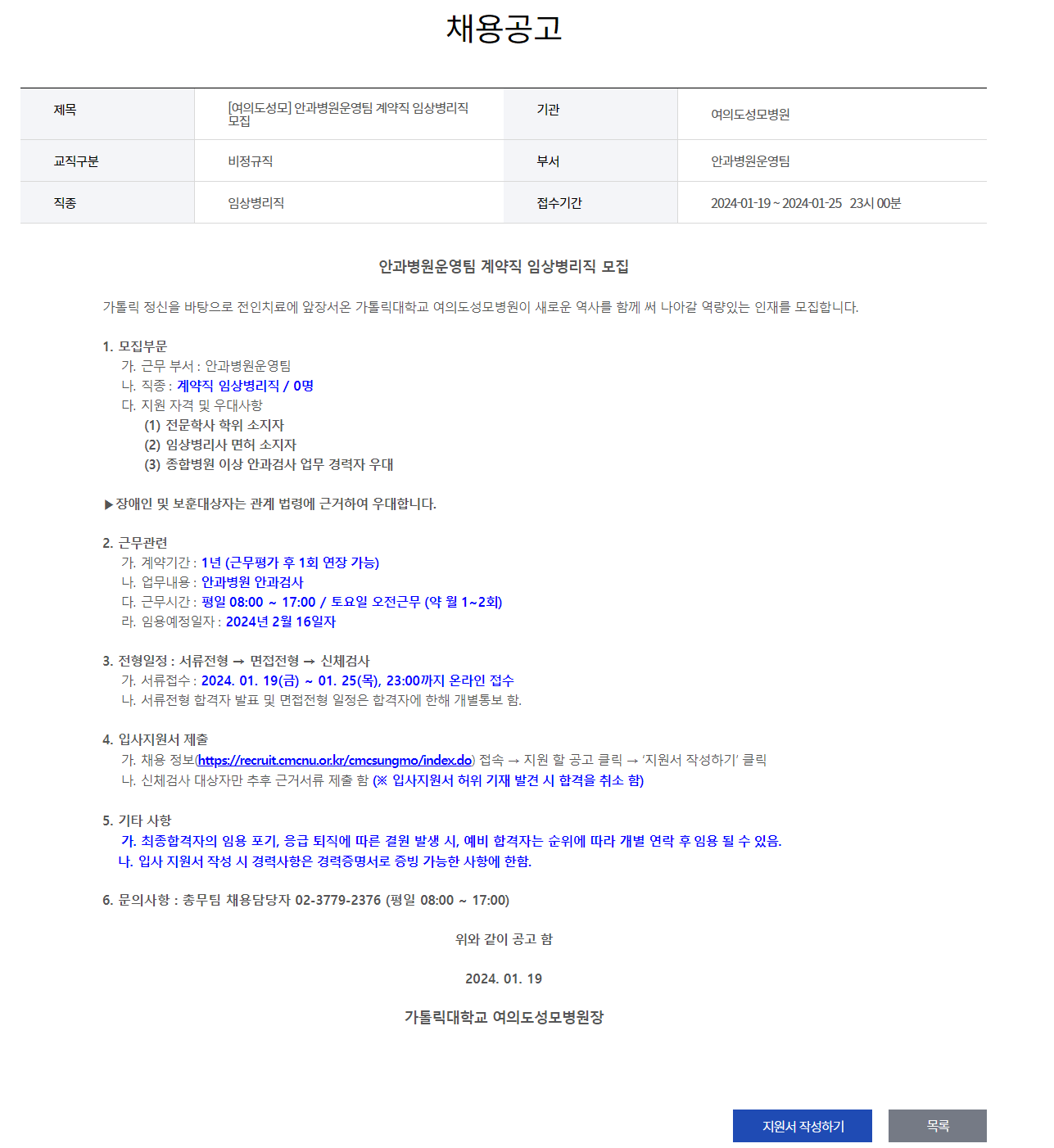 입사 지원: 채용공고 - 입사지원 - 가톨릭대학교 여의도성모병원 일반채용 (cmcnu.or.kr)