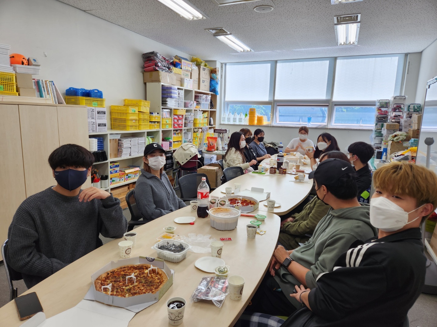 김효선 학과장님과 김경림 교수님께서  맘스터치,피자, 엽기떡볶이를 주문해주셔서 맛있게 먹게되었습니다.