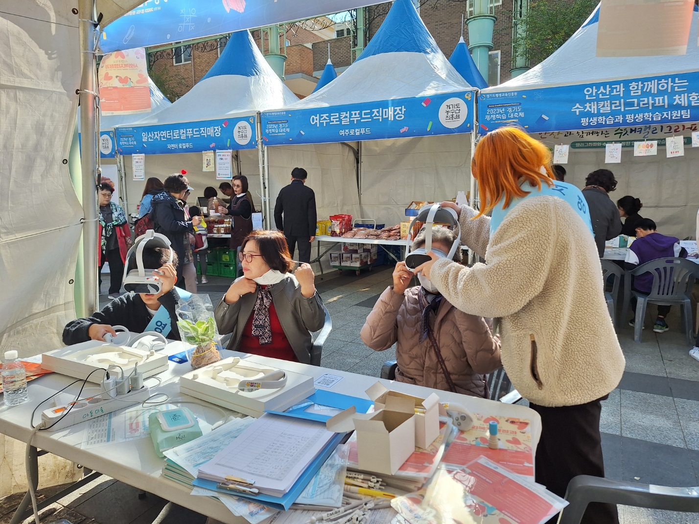 저희 교수님들 인솔하에 사회복지행정과 1,2학년 학생들이 VR 활용한 직무제험(인생 2모작)이라는 주제로 체험부스를 운영하였습니다.