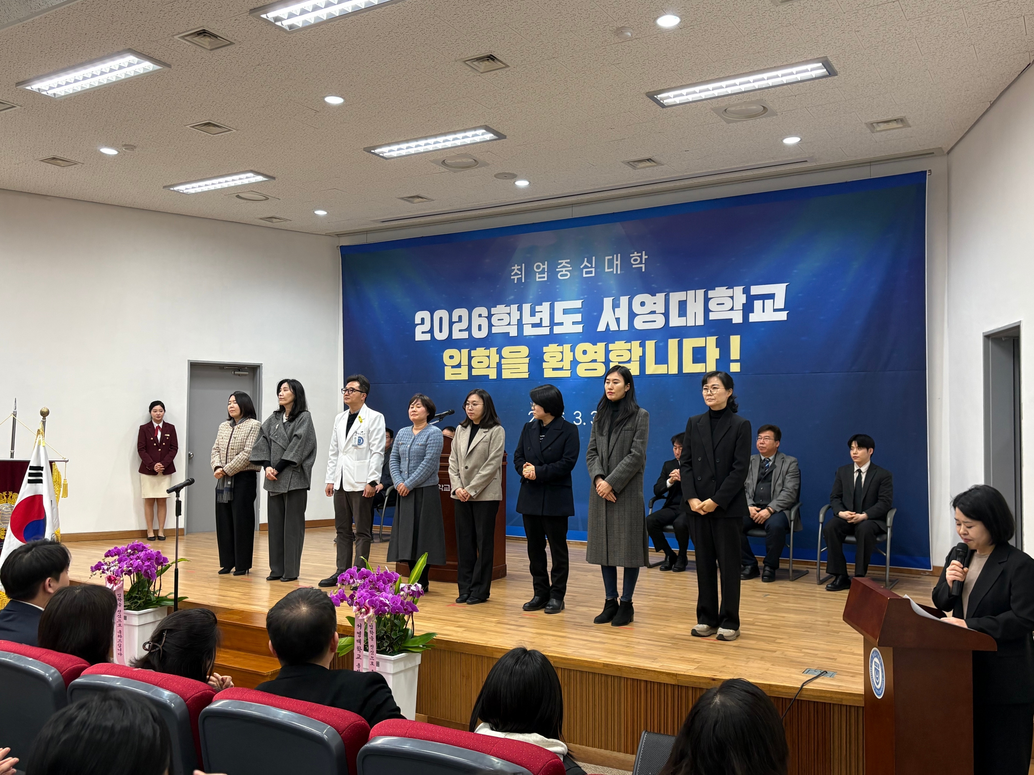 ○ 우리대학(총장 김정수)은 3월 3(화) ‘2026학년도 서영대학교 입학식을 개최하였다서영대학교 서강홀에서 진행된 이번 입학식에는 장철인 입학부총장, 김명재 취업처장, 김희재 기획부처장을 비롯한 학교 관계자와 교직원, 내빈, 신입생과 이를 축하하기 위한 가족 및 내빈이 참석하였다. 신입생들이 뜻깊은 순간을 함께할 수 있도록 주간반 신입생을 위한 주간 입학식과 야간반 신입생을 위한 야간 입학식으로 나누어 총 두 차례에 걸쳐 진행되었다.
