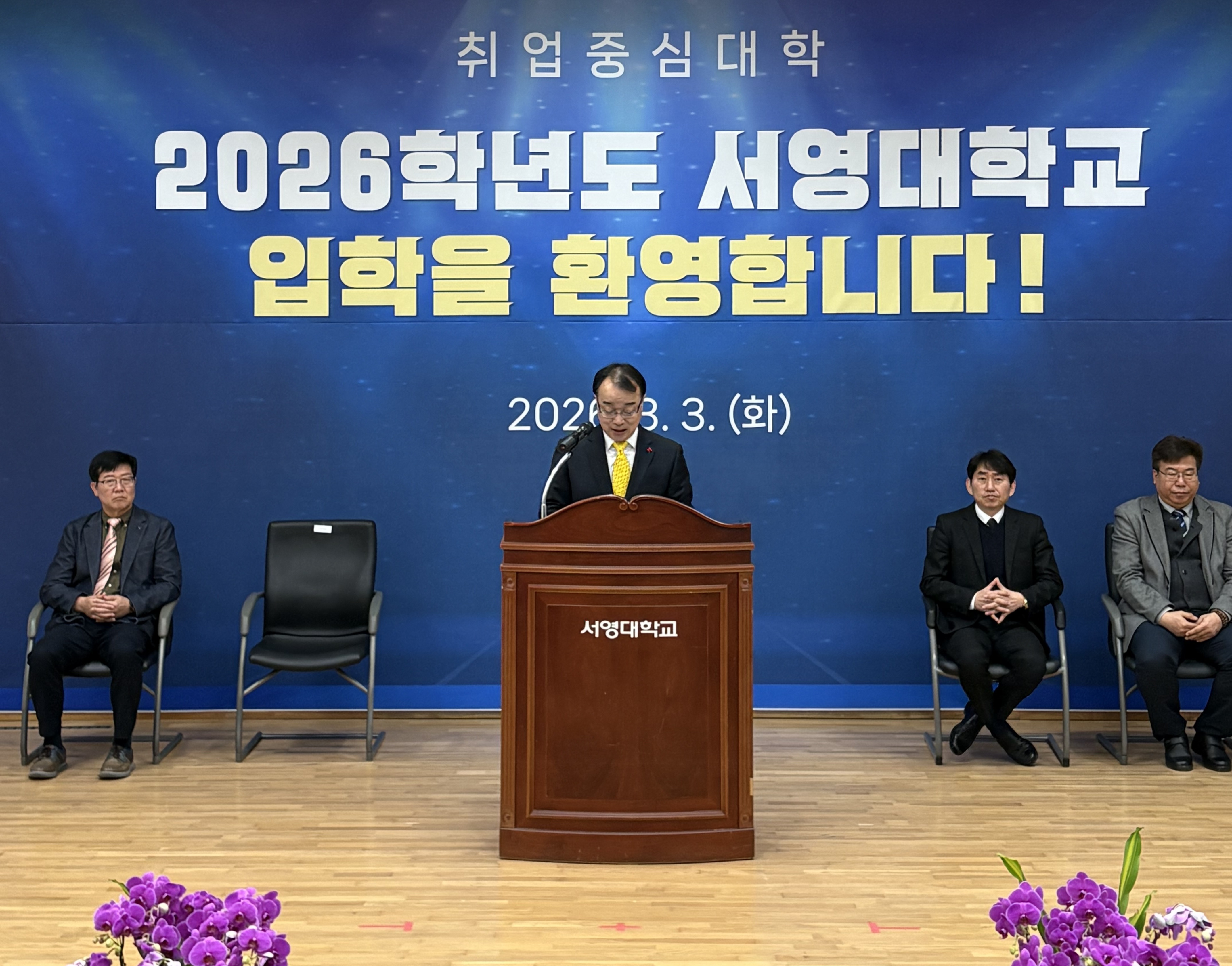 ○ 장철인 입학부총장은 축사를 통해 '서영의 교정에서 새로운 출발을 하는 신입생 여러분을 진심으로 환영한다. 대학에서의 배움은 단순히 지식을 쌓는 과정을 넘어 스스로를 발견하고 미래를 구체적으로 설계해 가는 소중한 시간이다. 대학 생활 속에서 분명한 목표를 세우고, 꾸준히 실력을 다져 더 큰 도약을 이루기 바란다. 우리 대학은 체계적인 교육과 따뜻한 지원을 바탕으로 여러분의 꿈을 실현할 수 있도록 든든한 동반자가 되겠다. 서영의 교정에서 마음껏 배우고 경험하며 더 큰 세상으로 힘차게 나아가길 바란다.”라고 전했다.